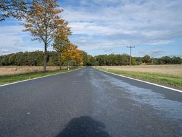 The autumnal landscape in Germany's rural countryside is a sight to behold, with its lush vegetation, clear sky, and horizon of green fields and woods. The tar road surface winds through the natural environment, with sunlight filtering through the leaves of a tree, while a distant twig casts its profile against the cloud-filled sky.