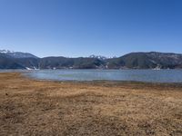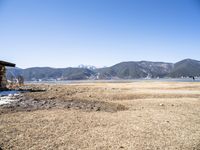 A view of a mountain range in the Yunnan province of China, with a lake reflecting the clear sky, surrounded by open space, grass, trees, and dirt, showing the natural environment and geology of the area. This rural landscape demonstrates the snow-capped mountain landforms of the Alps, and the coastal shorelines, reservoirs, and beaches of the region, all part of the ancient history and tourism of Shangri-La.