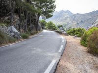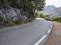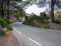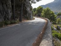 A driver navigates a winding road in the highland of the Balearic Islands, Spain. Asphalt, road surface, and lane markings are visible in the landscape, alongside a rock wall, trees, and vegetation. The clear sky and warm sunshine cast shadows on the path ahead, creating a picture of peaceful nature and infrastructure.