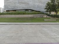 A composite material of beige and concrete fill the cityscape of Dallas, Texas. The downtown business district is home to an array of modern architecture, including limestone walls, asphalt roads, and wooden furniture. A museum, office building, and stadium are visible in the skyline, while a tree-lined residential neighborhood and skatepark fill the foreground.