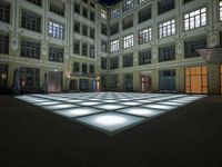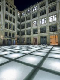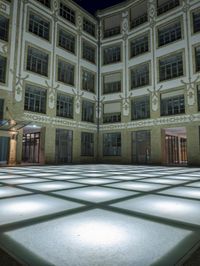 The vibrant night scene of Berlin, Germany, is illuminated by neon lights and classic architecture. Tourists explore the city's metropolitan area in search of art, business, and open space. Urban courtyards, office buildings, and neon lit condominiums are all part of the city's unique architectural structure and mixed-use family estate. The symmetry of the lines and the artificial light of the floors, windows, and facades create a captivating scene of a European metropolis.
