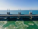Aerial view of a modern cityscape in Holland, featuring a mixed-use landscape with automotive exteriors, vehicles, boats and boating equipment and supplies, a rocket, a tank ship, a bridge, a public utility, wind turbines, and a beach.