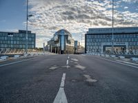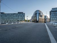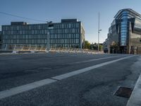 The business district of Berlin, Germany is illuminated by the sun during break of day. The cityscape is made up of modern architecture, high-rise condominiums, office buildings, and residential areas. The roads are lined with composite material, trees, and street lights while the clear sky casts hard shadows across the thoroughfare.