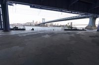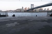 A view of the metropolitan area of New York City from the skyway, showing the boardwalk, river, jetty, and bridge, along with the cityscape of buildings, open spaces, and urban public spaces reflecting off the floor of the harbor on a clear day.