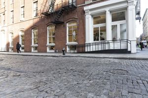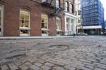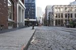 A low angle view of the architectural buildings and cobblestone roads in New York City, USA.