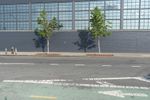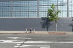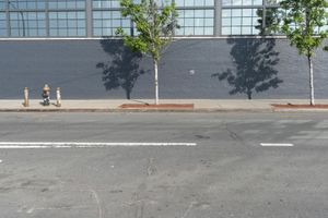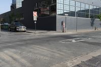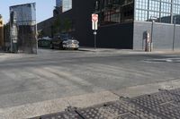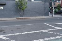 Dawn in New York City, USA reveals the urban infrastructure of the residential neighborhood, featuring a bustling road surface lined with a brick wall, low buildings with a facade, and the profile of a vehicle.
