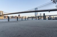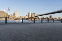 A view of Manhattan, New York City, USA, featuring a river, high-rise buildings, and a suspension bridge, at dawn.