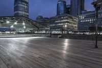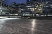 A panoramic view of New York City, a metropolitan area in the USA, by night. The cityscape features skyscrapers, factories, and a harbor, illuminated by artificial light and the contrails of a jetty. The wood floor of Manhattan, Jersey, and the downtown area, as well as the coastal water of the ocean, river, and boardwalk, can be seen in the distance.