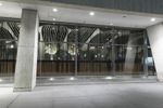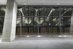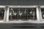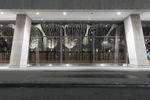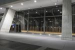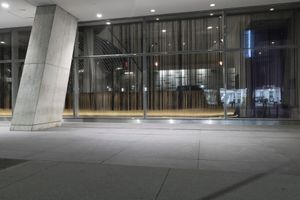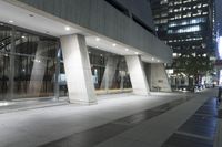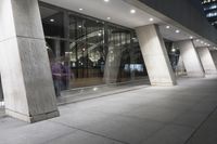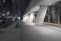 A snapshot of New York City at night, featuring the city's iconic architecture, glass and steel walls, and low concrete buildings. The metropolitan area's infrastructure, open spaces and public transportation are also visible, as well as the artificial lighting reflecting off the glass facade, asphalt road surfaces, and walkways.