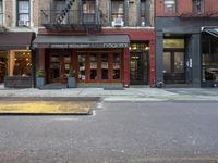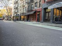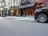 A yellow sedan travels down a cobblestone road in the bustling Soho neighborhood of Manhattan, New York City, USA. The classic architecture of the mixed-use buildings, cafes, and stores creates an iconic urban landscape.