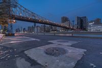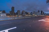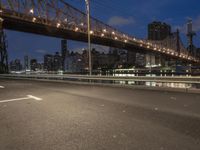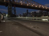 A panoramic view of New York City's metropolitan area in the US, featuring a modern concrete bridge, highway, street lights, Armco barriers, and a river reflecting the city's skyline. The infrastructure, artificial light, and traffic of the urban metropolis at night create a unique biome of human settlement, transport, and real estate.