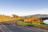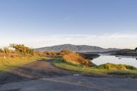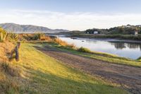 A breathtaking view of the coastal landscape in New Zealand at dawn, with water, dirt, and grass surfaces. The day breaks over the highland hills, revealing a yellow-hued ocean and a wilderness of clouds. A gravel road leads straight down to a crystal clear lake, surrounded by trees. The clear sky above is adorned with contrails, adding to the beauty of this natural environment. This scenic destination is perfect for outdoor activities and a peaceful arrival in the low-lying coastal area.