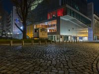 A view of the modern architecture in the business district of Berlin, Germany, at night. The illuminated buildings showcase a mix of different styles with their striking facades, glass windows, and yellow lighting. The city's metropolitan area is known for its vibrant business scene and impressive office buildings. The cobblestone road surface adds charm to the urban landscape. Europe's business hub is a blend of light and dark, creating a captivating profile against the night sky. The tree-lined streets and tiled flooring complete the city's dynamic atmosphere.