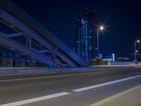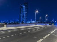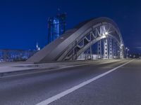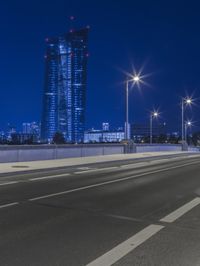 The illuminated cityscape of Frankfurt, Germany, is seen from a cable-stayed bridge. The blue sky and yellow streetlights create a beautiful contrast against the dark iron, steel, and concrete bridge, and the highway running straight down the road. A mix of skyscrapers and trees line the cityscape, adding to its metropolitan vibrancy.