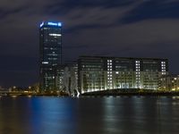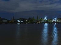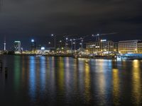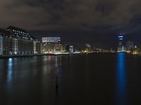 A stunning view of Berlin's modern architecture and cityscape at night with reflections in the water.