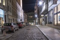 A stunning view of the cityscape of Brno, Czech Republic at night, showcasing the classic architecture and cobblestone streets illuminated by artificial street lights.
