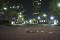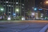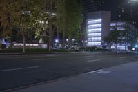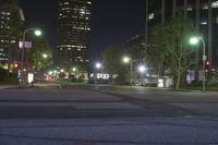 An aerial view of a metropolitan area in Los Angeles, California, USA. The cityscape features a mix of low modern architecture, residential area, business district, tree lined roads, yellow street lights, and office buildings lit up in the night.