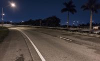 A view of a residential street in Miami, Florida, USA at night, with street lights illuminating the asphalt road and surrounding trees. The clear sky and dark ambiance create a captivating urban atmosphere.