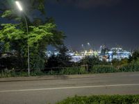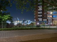 A view of the residential area in Hamburg, Germany, with illuminated streets and street lights creating a beautiful artificial light display on the roads and trees in the metropolitan area.