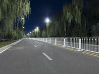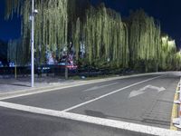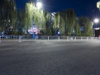 A view of the metropolitan area in Beijing, China, featuring an asphalt road winding along a tree-lined path with a crosswalk, illuminated by artificial light from the streetlights and stadium. This controlled access highway is a popular mode of transport in the urban area.