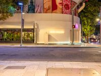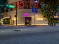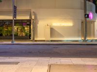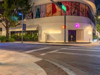A view of Miami Beach, Florida, USA, with modern architecture, shops, and road illuminated by artificial light and street lights, creating a unique urban design and experience.