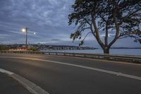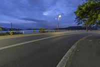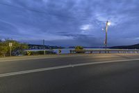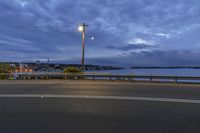 A gloomy night road with artificial street lights and a grey sky in a coastal city.