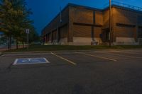 A view of a cityscape at night in Toronto, Ontario, Canada. The urban landscape is illuminated by artificial lights, casting a warm glow on the buildings, roads, and vegetation. A row of street lights and a parking lot add to the urban design of the residential area. The dark sky is filled with clouds, creating a dramatic atmosphere.