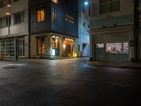 View of a wet road at night in the city of Tokyo, Japan, with store fronts lit up by artificial light and a street light in the one quarter profile view.