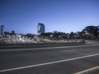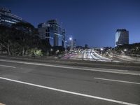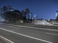 A stunning view of a city's modern architecture and skyline at night with skyscrapers, office buildings, and street lights illuminating the cityscape.