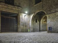 A city street in Barcelona, Spain, illuminated by the warm glow of street lights. The low lighting casts a mysterious ambiance on the old town's brick walls and gothic architecture. The cobblestone road and symmetrically designed facades create a charming atmosphere. Shopfronts with bright artificial lights add to the lively urban scene in this European city.