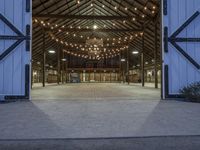 Aerial view of a warehouse in California at night, showcasing the architectural design and the city lights
