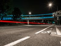 Low angle view of a bridge and underpass in a city in California, USA with tree-lined roads and street lights