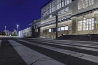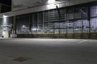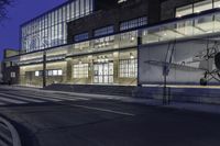 Low angle view of a modern office building facade in the financial district of Toronto, Canada at night with artificial light illuminating the street and clear sky in the background.