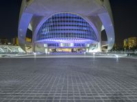 A captivating night view of the modern architecture in Valencia, Spain. The city's metropolitan area showcases a mix of futuristic buildings, with a stunning stadium and convention center. The straight down the road perspective highlights the symmetrical facades and the play of artificial light on the surface. The cobblestone streets add charm to this urban metropolis in Europe.
