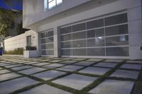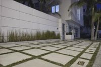 A stunning night view of a residential area in California, USA, showcasing the beautiful architecture and design of the buildings, with a well-lit courtyard and an open space filled with palm trees and lush green grass.