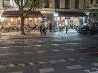 A view of the vibrant city of Berlin, Germany at night. The illuminated residential buildings and infrastructure create a captivating urban design. The city streets are lined with trees and artificial lights, adding to the lively atmosphere. In the foreground, a bicycle is parked near a restaurant, highlighting the city's active nightlife. This photo captures the essence of Berlin's urban charm and European ambiance.