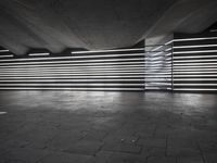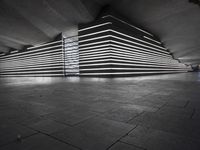 A monochromatic view of the urban infrastructure of Manhattan, New York City, USA. Automobiles, skyscrapers, and light streaks illuminate the concrete facade and open plaza of this metropolitan area on a dark night.