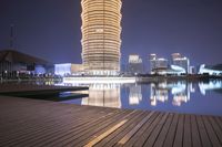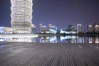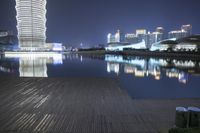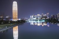 The illuminated skyline of Zhengzhou, China, with its modern architecture, mixed-use high-rises, condominium towers, and coastal wood structures, reflects off of the open concrete water surface of the metropolitan area, making for a stunning cityscape of artificial light and futuristic architecture.