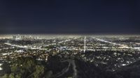 An elevated and breathtaking aerial view of the Los Angeles cityscape at night, showcasing the high-rise buildings, illuminated skyline, and bustling metropolitan atmosphere of this iconic city in California, USA.