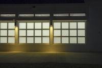 The dark night highlights the architectural beauty of an abandoned warehouse, with its impressive facade and glass windows.