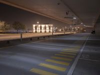 A view of the city streets and architecture of Porto, Portugal at night, with concrete and asphalt roads, street lights, and a parking garage.
