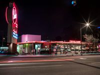 A bustling city street in California, USA, illuminated by street lights and the glow of residential buildings at night.
