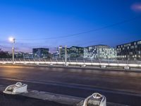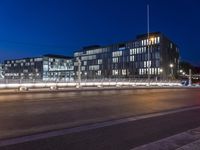 A stunning view of Berlin's modern architecture and city lights at night.