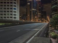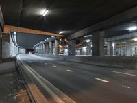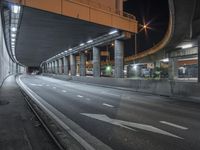 A stunning view of a city at night, with a bridge and urban infrastructure. The city lights illuminate the asphalt roads and concrete underpass, creating a beautiful composite of light and darkness.