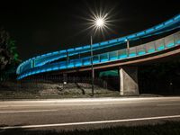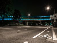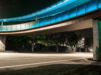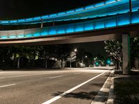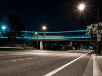 A low angle view of a city street in California, USA. The urban landscape is illuminated by street lights and the glow of office buildings. The bridge and underpass add depth to the composition. The clear sky above contrasts with the dark cityscape below.