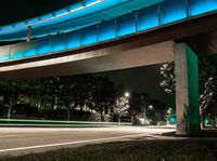 A stunning view of a city street at midnight in California, USA. The road surface glistens with raindrops, illuminated by street lights and the glow of office buildings. The clear sky is dotted with clouds, and a bridge spans the river below.