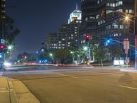 A stunning view of the modern architecture and cityscape of Los Angeles, California, USA at night. The illuminated buildings, tree-lined streets, and bright city lights create a captivating scene in this bustling urban neighborhood.