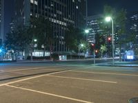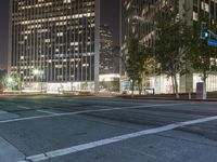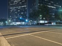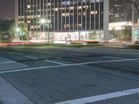 A stunning view of the modern architecture and city lights of downtown Los Angeles at night, with traffic streaks on the roads, illuminated street lights, and a beautiful skyline.