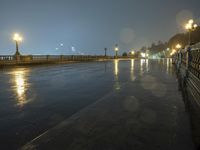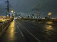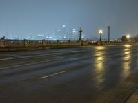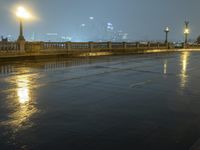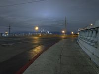 A stunning view of the Los Angeles skyline at night, with city lights reflecting on the water and a cloudy sky above. The road and bridge below are illuminated by street lights, creating a captivating urban scene in this metropolitan area.
