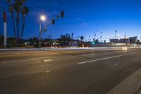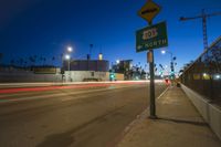 A stunning view of the city of Los Angeles at night, with its illuminated streets and towering buildings. The photo captures the beauty of the city's metropolitan area, showcasing the urban design and vibrant city life. The dark sky contrasts with the bright lights of the streetlights, creating a captivating scene. In the foreground, a road with asphalt and lane markings leads into the city, symbolizing the bustling transport infrastructure. Clouds in the sky add an atmospheric touch to the image.